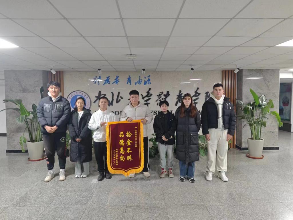 偷拍av 学生刘忠旭、王艺程、崔倩若、代雨、张欣语、商雨喆11月25日下午在11505h教室捡到一个笔袋,里面装有文具、身份证和千元现金。在等待一段时间没有等到失主的情况下,同学们及时汇报学院,经学院努力成功找到失主并物归原主。失主于11月27日来到偷拍av ,为以上学生送来了锦旗。