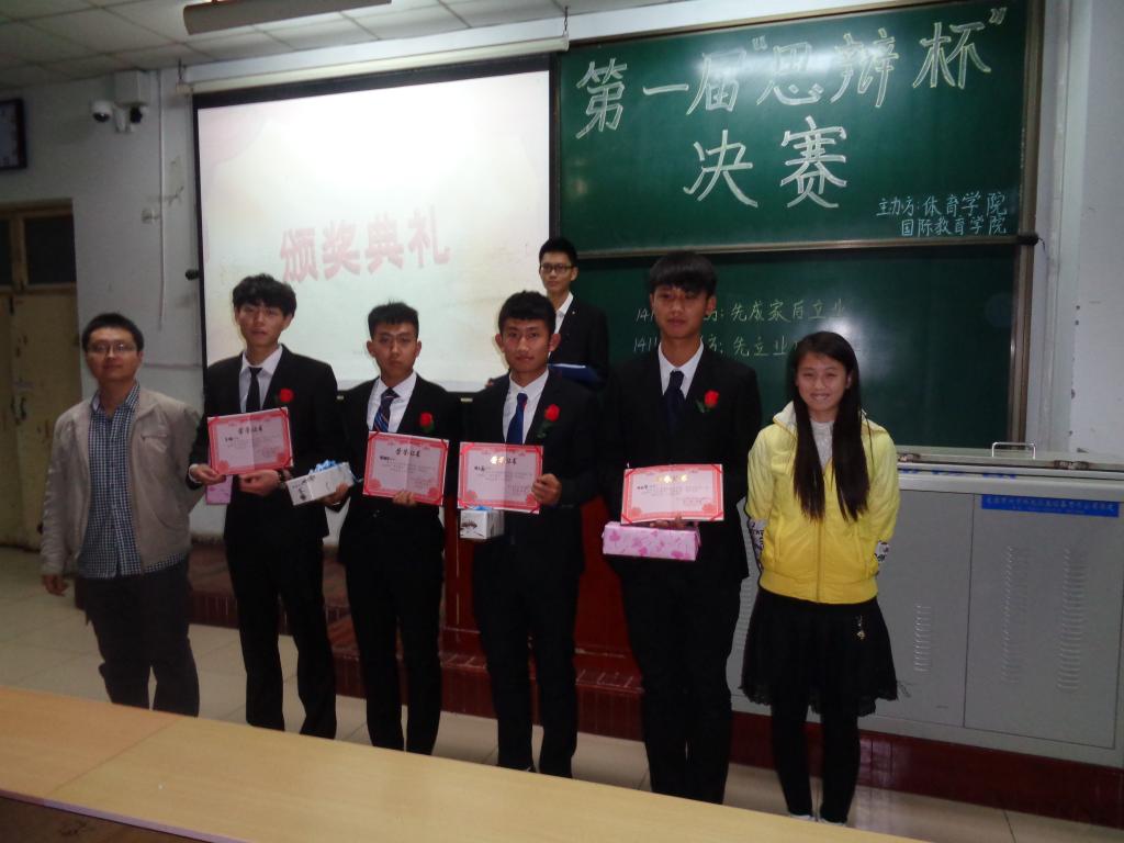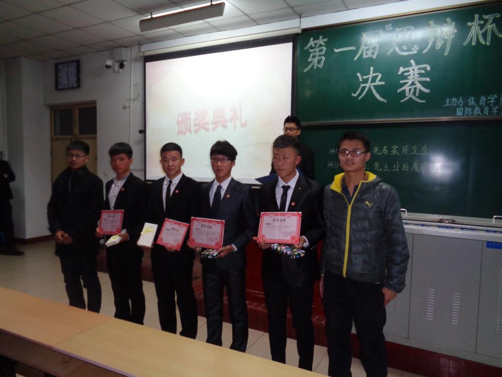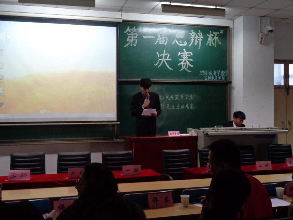 和国际教育学院学习部举办的第一届“思辩杯”决赛于11412教室隆重开始;到场的嘉宾有各学院学习部部长,及各班的拉拉队;经过主持人开场白后比赛正式开始;场上对战双方都就己方的观点做了充分准备,比赛过程中场上辩手旁征博引,妙语连珠,双方争锋激烈,互不相让,为大家奉献了一场有理有据不失礼节的精彩辩论。