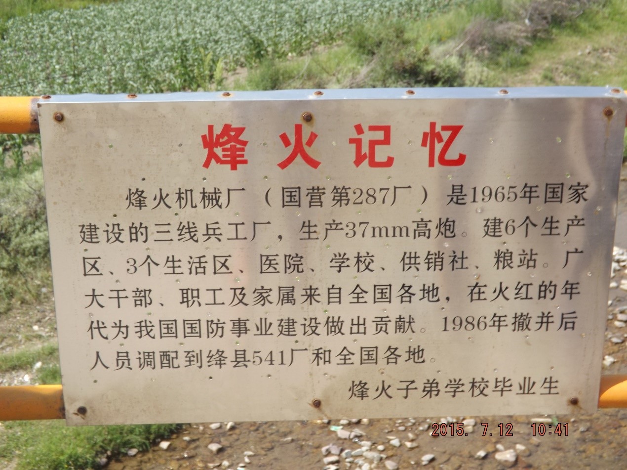 烽火机械厂是国营第287厂,是1965年国家建设的三线兵工厂,主要生产37mm高炮。建有6个生产区、3个生活区、医院、学校、供销社、粮站。广大干部、职工及家属来自全国各地。他们在火红的年代为我国国防事业建设做出了杰出的贡献。1986年撤并后,机械厂人员调配到绛县541厂和全国各地,依旧在为祖国的繁荣富强默默的做着贡献。