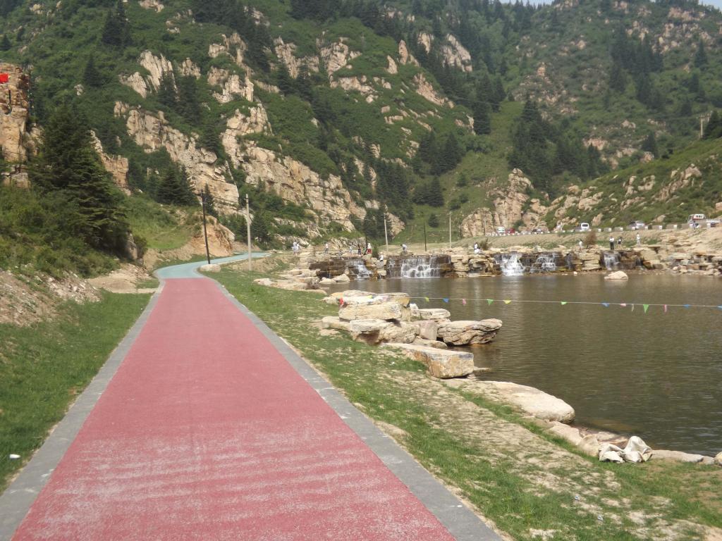 公园的河水是天然的矿泉水,清澈见底,却冰冷刺骨,将脚伸入河水中就像是踩进了冰雪之中。河面上偶尔还有一艘小船划过,仿佛在诉说着这里近年来翻天覆地的变化。公园内用红、蓝间隔的石子铺成的一条平坦的小路,远处看去像极了运动场上的跑道,这对我们来说产生一种莫名的吸引力。这也是今天实践队前来此处考察的原因之一。