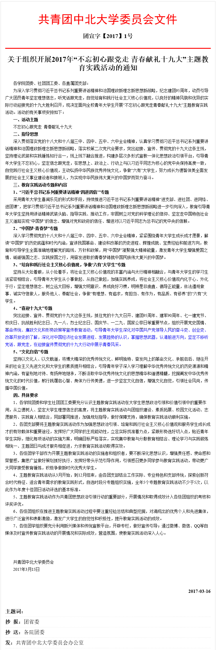 关于组织开展2017年“不忘初心跟党走 青春献礼十九大”主题教育实践活动的通知