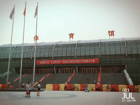 2017年7月9日,我们暑期实践队来到了山西省体育馆前,在这里刚刚举办了运城第三届“九天家私杯”传统武术即现代搏击公开赛的开幕式。