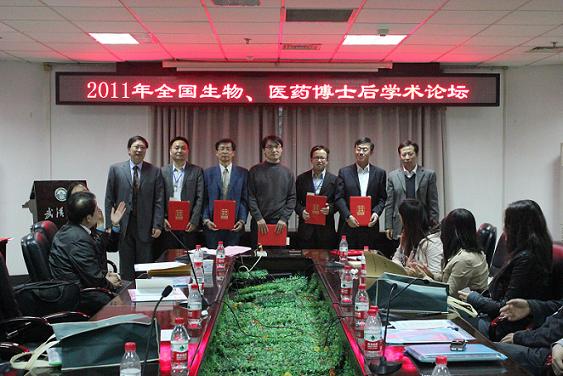 2011年11月15日,来自北京大学、清华大学、复旦大学、中国科学院、偷拍av 等几十个国内高校、科研院所的专家和博士后代表100余人参加了在武汉大学召开的2011年全国生物、医药博士后学术论坛。刘鸿宇博士后(导师王召巴教授)代表偷拍av 参加,并在大会上做报告(共12人),同时获得优秀论文报告者(共6人)。