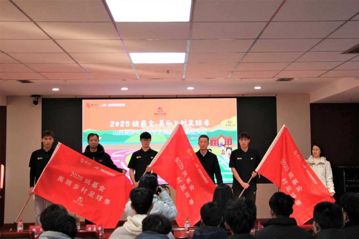 授旗环节将仪式推向高潮。志愿者代表黄家豪、侯冠秀、吴子严从三位领导手中接过印有“姚基金美丽乡村足球季”字样的队旗。红旗挥舞间,全体志愿者庄严宣誓。