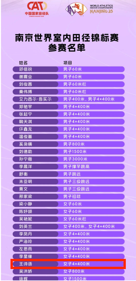 在女子400米决赛中,王诗语同学继续保持高水平的竞技状态,以55秒34的优异成绩获得铜牌,并成功入选南京世界田联室内田径锦标赛女子4×400米项目参赛名单。