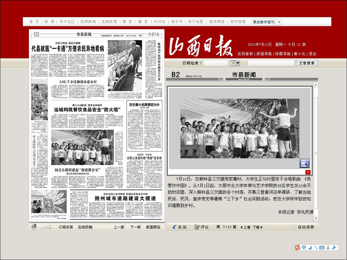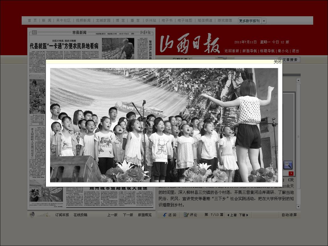 7月10日,在柳林县三交镇党家寨村,大学生正与村里孩子合唱歌曲 《我爱你中国》。从7月1日起,太原偷拍av 体育与艺术学院的35名学生在10余天的时间里,深入柳林县三交镇的各个村落,开展三晋黄河沿岸调研、了解当地民俗、民风、宣讲党史等暑期“三下乡”社会实践活动,把在大学所学到的知识播撒到乡村。 本报记者 李兆民摄