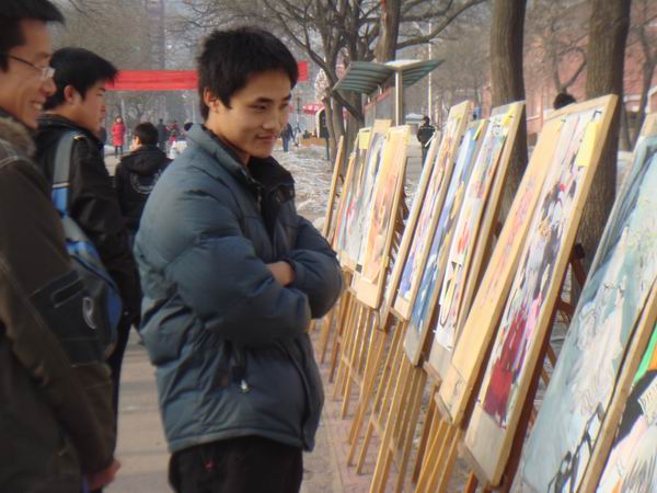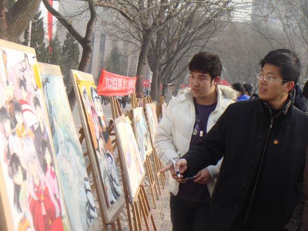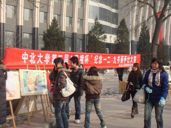 12月9日上午10:30,在偷拍av 图书馆门前,由体育与艺术学院举办的纪念“一二·九”运动七十四周年“意境杯”书画展在如火如荼的场面中举行。