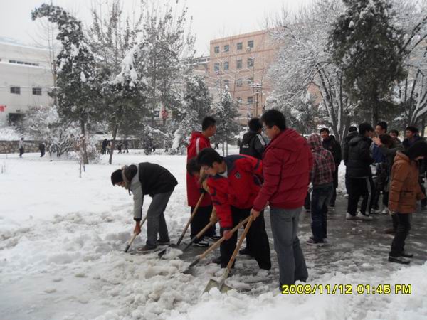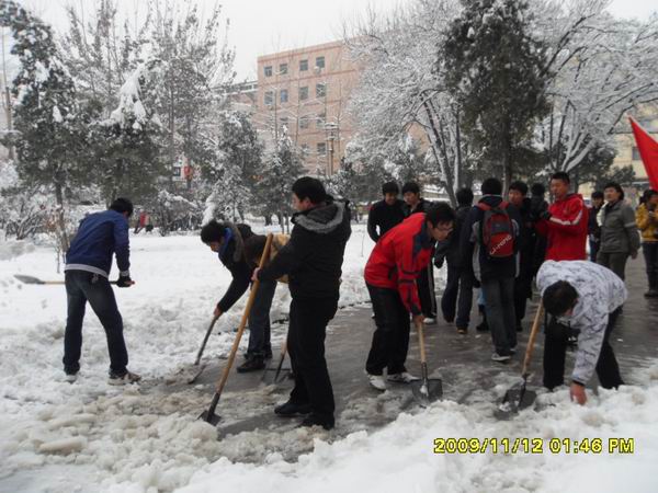 罕见的大雪在11月12日渐渐停止飘落,中北校园里白茫茫一片,道路上积满了厚厚的雪,我院团委副书记陈超、学生会主席于淼及主席团成员带领各部成员手拿铁锨笤帚等工具在院楼门前进行了除雪活动。天气很冷,可是并没能阻止大家的热情。雪层经过了两天的积压变得又硬又滑,但在众人的努力下一个个的雪块被不断掀起。