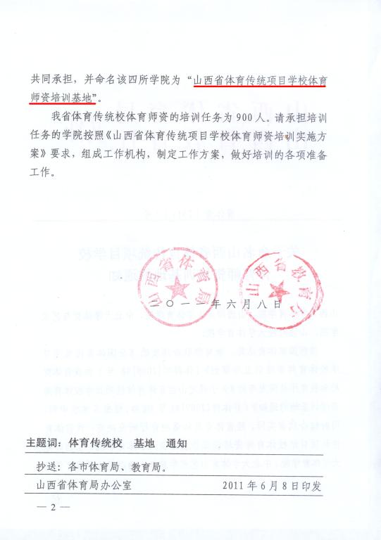 近日,山西省体育局、教育厅联合下发《关于命名山西省体育传统项目学校师资培训基地的通知》,命名我院为山西省体育传统项目学校师资培训基地。