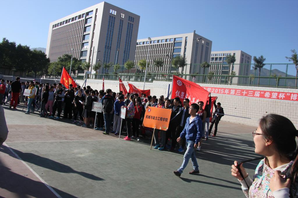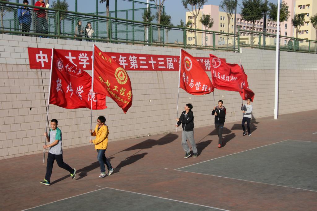 来自12个学院男女共24支队伍参加了开幕式,在热烈的氛围中,各学院的旗帜随风飘扬,并绕场一周。最后由副校长沈兴全教授吹哨开球,拉开了本次排球赛的帷幕。