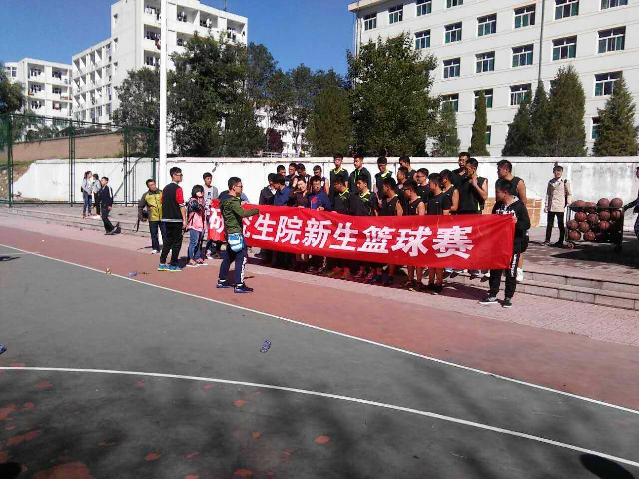 2016108日上午,在东区塑胶篮球场研究生院举办的2016级新生杯篮球赛中,我院Y161101班全体篮球队员以及啦啦队员在领队牛会康老师以及教练员夏炎老师的带领下,经过一周的激烈角逐, 我院Y161101班顺利进入冠、亚军争夺赛。