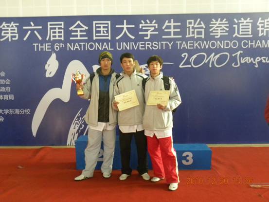 2010年参加第六届全国大学生跆拳道锦标赛偷拍av 学生宗西号在高水平组荣获男子78公斤银牌,李新建在高水平组荣获男子62公斤铜牌,谷跃在高水平组荣获女子+72公斤铜牌,周晓宇、李冠宇分别在女子63公斤和男子58公斤获第五名。