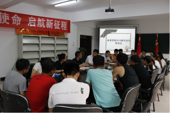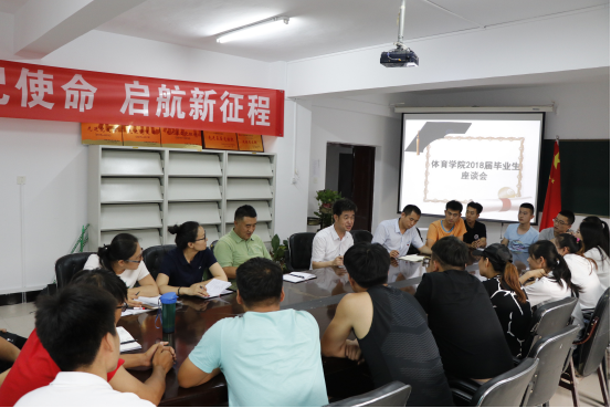 2018届毕业生代表座谈会在院楼党员之家举行。体育学院党委书记王政宇、党委副书记贾鹏、副院长王晓刚、副院长吴剑、各学科部、教学科、学生科负责人以及各专业本科毕业生代表参加了座谈。